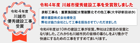 表彰工事名: 重要施設配水管耐震化その他工事(大字砂新田ほか) 櫻井建設株式会社様受注 弊社は協力会社として工事を担当させていただきました